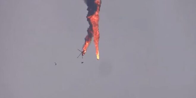 يظهر المقطع، البالغة مدته 57 ثانية، طائرة مروحية تشتعل فيها النيران، قبل فقدان السيطرة عليها وتحطمها.