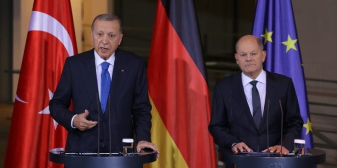 تداول نشطاء على مواقع التواصل الاجتماعي مقاطع فيديو من المؤتمر الصحفي الذي عقده الرئيس التركي، رجب طيب أردوغان مع المستشار الألماني، أولاف شولتس من برلين، الجمعة.