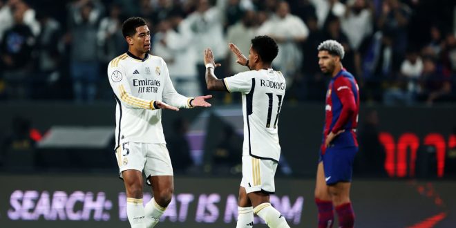 فاز نادي ريال مدريد على نظيره برشلونة بأربعة أهداف مقابل هدف واحد، في نهائي كأس السوبر الإسباني، الذي أقيم على أرض ملعب “الأول بارك”، الأحد، في السعودية.