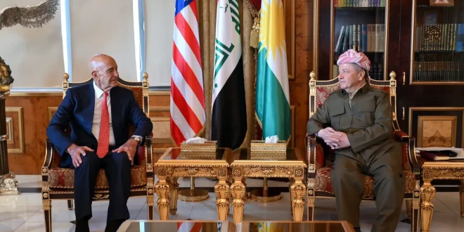 وقال مقر بارزاني في بيان ورد للوكالة، إن “بارزاني استقبل في مصيف صلاح الدين (بيرمام)، توم باراك، مبعوث الرئيس ترمب لشؤون سوريا والسفير الأميركي لدى تركيا توم باراك، والوفد المرافق”.