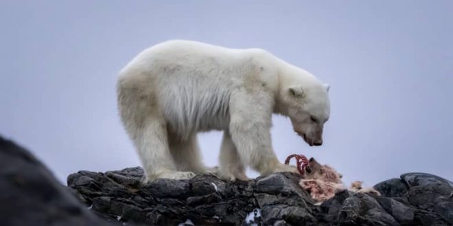 تُلطّخ الدماء أحيانًا طبقة الثلوج في أعماق الدائرة القطبية الشمالية. وعند نهاية أثر الدماء، قد يشكّل مشهد دب قطبي بالغ أمام جثّة شبل من الدببة أمرًا متكررًا بشكلٍ زائد بظل الاحتباس الحراري.